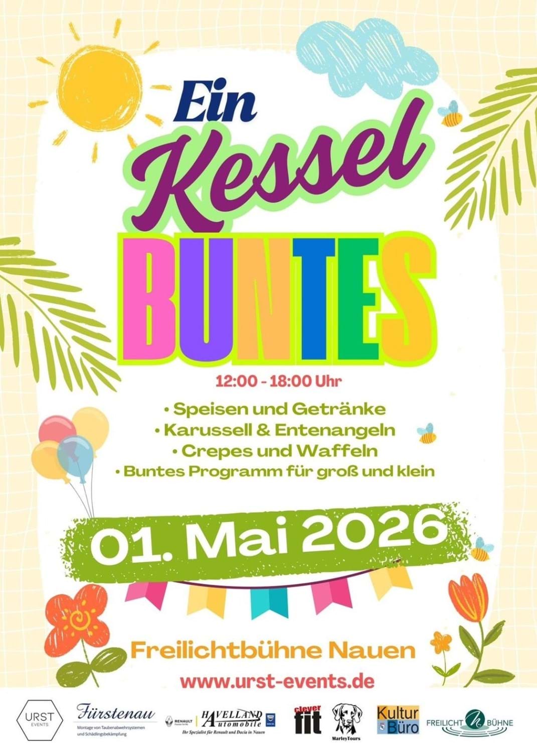 Der 1. Mai wird in Nauens grüner Mitte im Stadtpark mit „Ein Kessel Buntes“ gefeiert. Was wäre der Maifeiertag ohne einen Ausflug in die Frühlingswelt, ohne buntes Treiben unterm Maibaum?