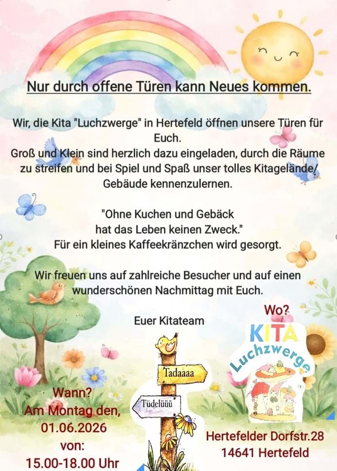 Wir, die Kita „Luchzwerge“ aus Hertefeld/Bergerdamm, laden Groß und Klein zum Tag der offenen Tür ein.