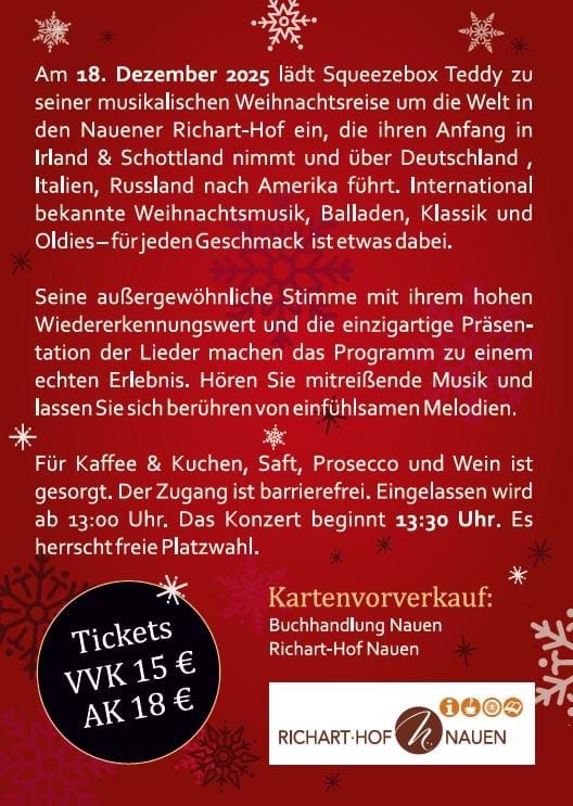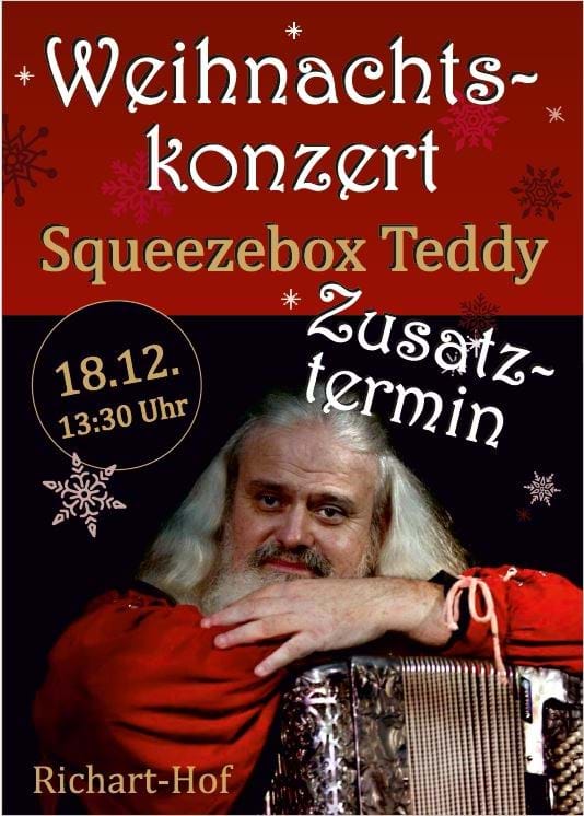 Squeezebox Teddy lädt am 18.12.2025 zusätzlich um 13:30 Uhr in den Richart-Hof, mit seiner musikalischen Weihnachtsreise um die Welt.