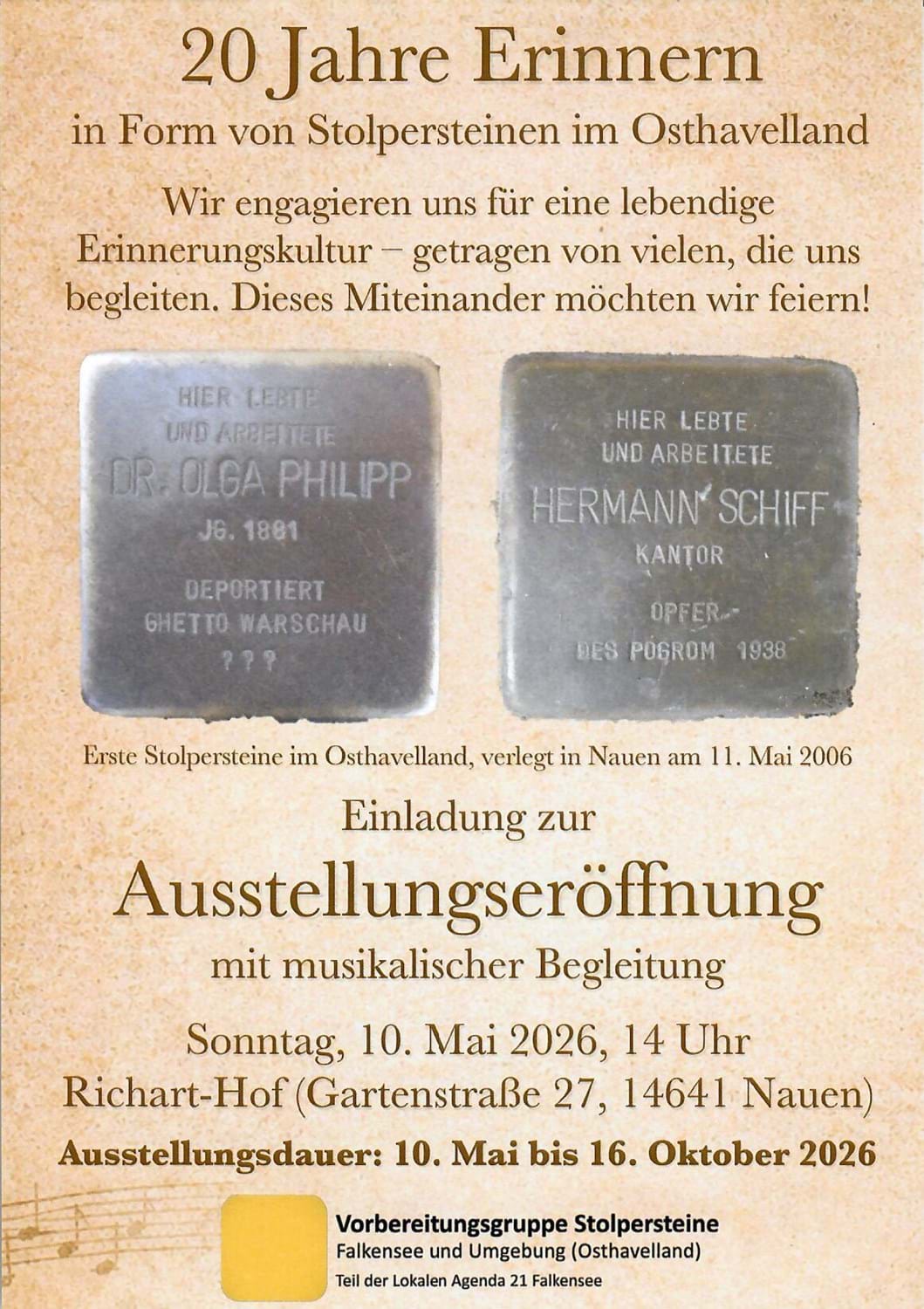 Zur Erinnerung an die erste Verlegung am 11. Mai 2006 in Nauen und dem 20-jährigen Bestehen der Vorbereitungsgruppe Stolpersteine Falkensee und dem Osthavelland.