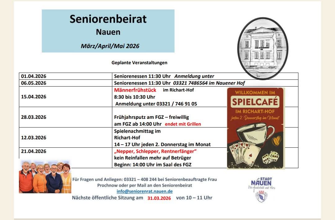 Die genauen Termine sind bei der Seniorenbeauftragten der Stadt Nauen zu erfragen. Ebenso ist eine Anmeldung zu den einzelnen Mittagstischen erwünscht.
