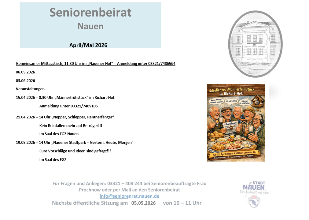Die genauen Termine sind bei der Seniorenbeauftragten der Stadt Nauen zu erfragen. Ebenso ist eine Anmeldung zu den einzelnen Mittagstischen erwünscht.