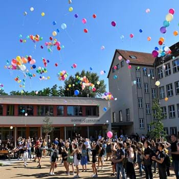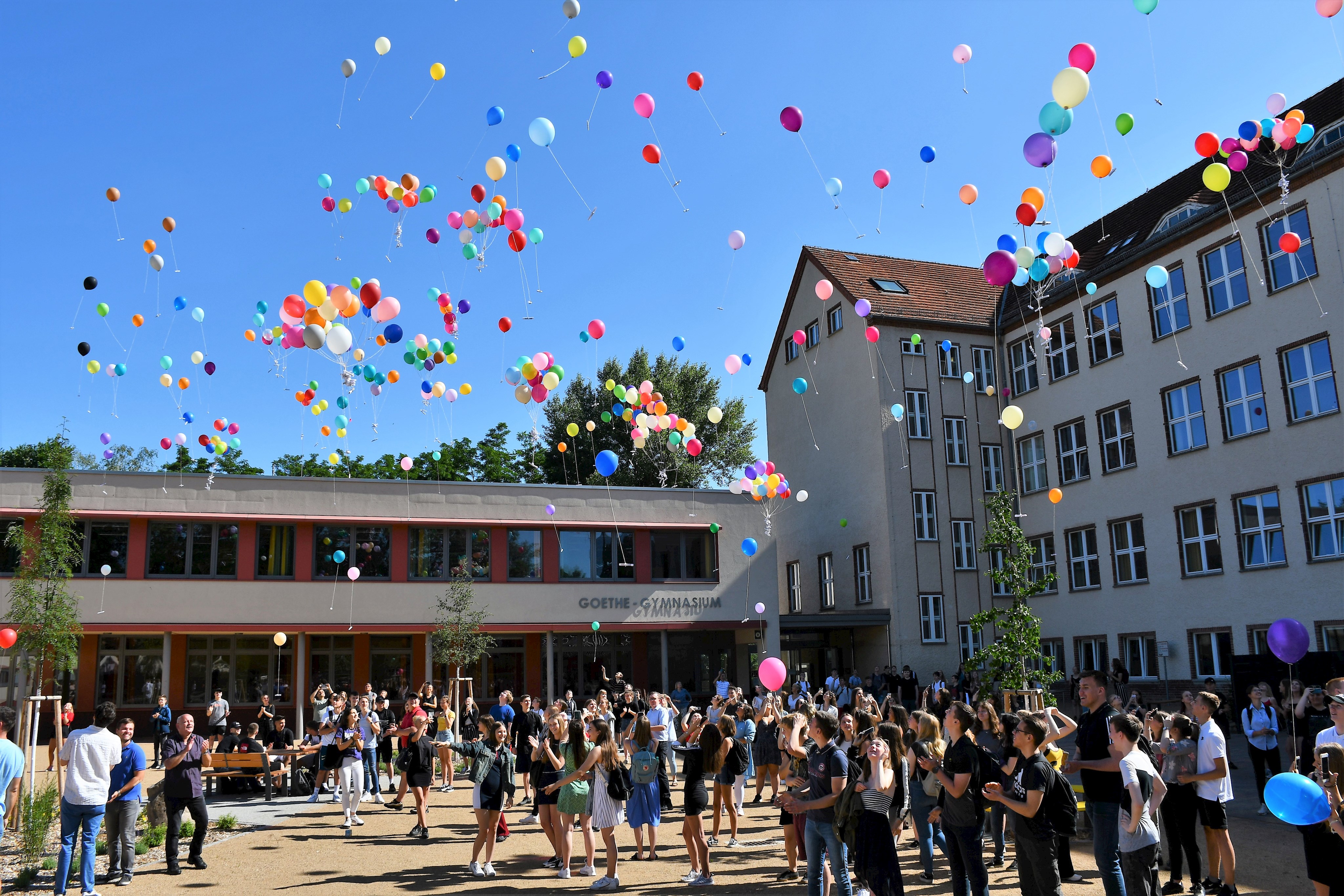 Bildunterschrift: Ab in die Ferien! Wenige Tage nach der offiziellen Abiturfeier im Funkamt ließen Schülerinnen und Schüler der elften Klassen des GGN biologisch abbaubare Luftballons auf dem Schulhof in den Himmel Richtung Süden steigen. Die Ballons sind mit einem QR-Code versehen: Der Klassenverband, dessen Ballon gefunden wird und dabei die weiteste Strecke zurücklegt, erhält einen Bonus-Wandertag.