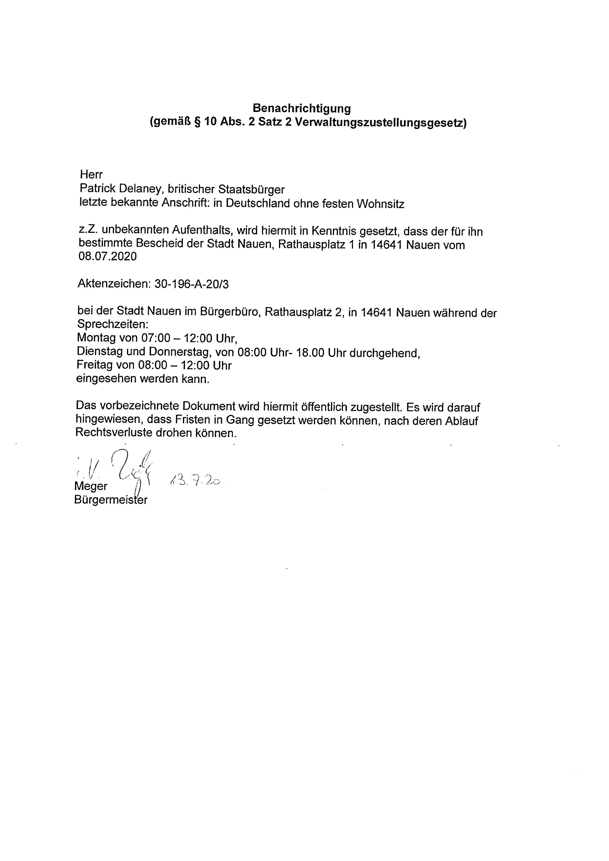 Benachrichtigung (gemäß § 10, Abs. 2, Satz 2 Verwaltungszustellungsgesetz) an Herrn Patrick Delaney, britischer Staatsbürger