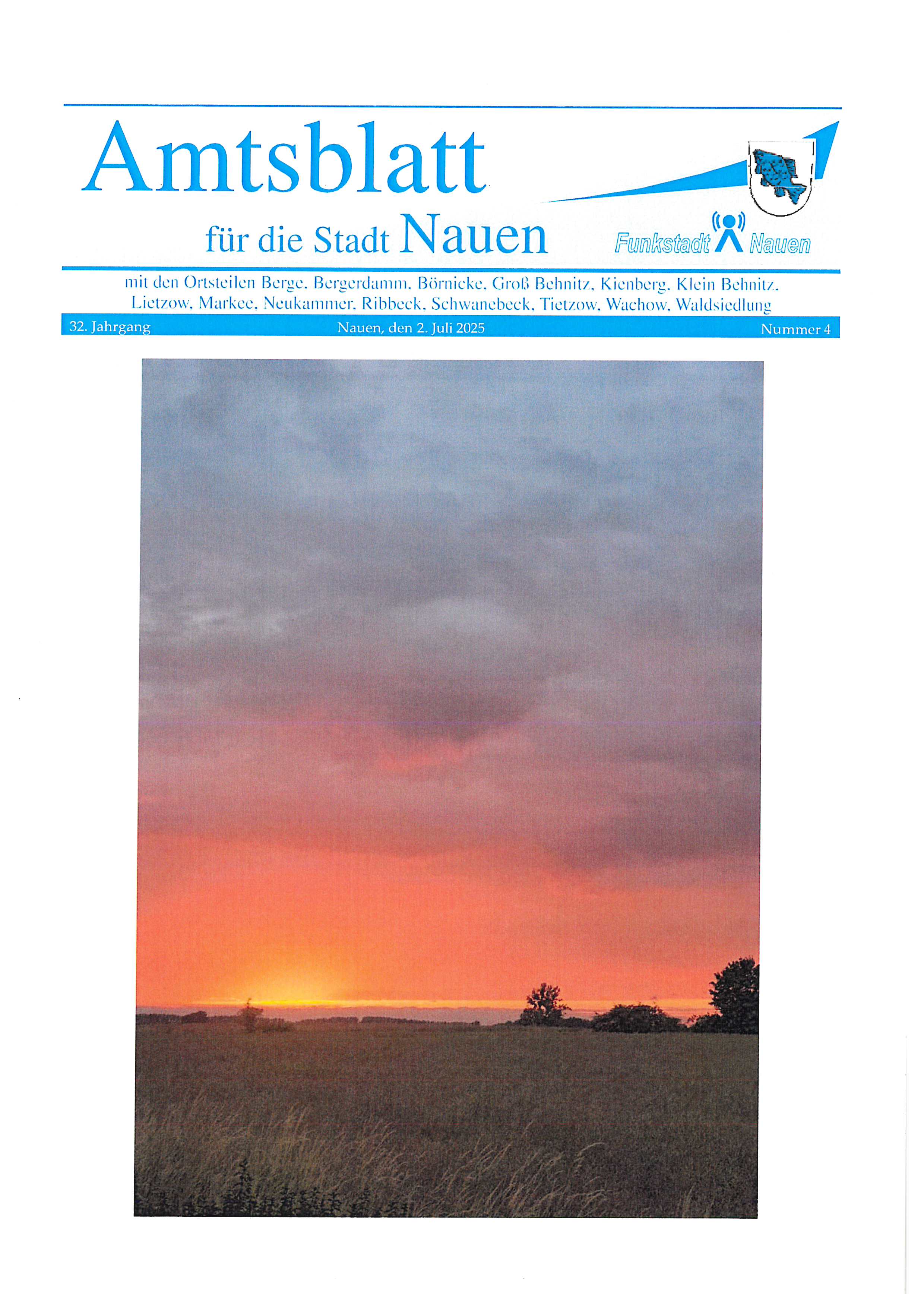 Das Amtsblatt für die Stadt Nauen, Nr. 4 ist am 2. Juli 2025 erschienen
