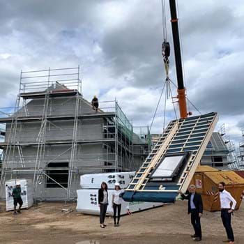 Mit einem großen Kran wurden die vorproduzierten, tonnenschweren Dachelemente direkt vom Lkw auf die Häuser gehievt. „Mit dem Bauprojekt wird der Ansatz vorangetrieben, bezahlbares Wohneigentum für junge Familien mit Kindern in Nauen zu schaffen, das sowohl ökonomisch als auch ökologisch nachhaltig ist“, sagte Dr. Lehmann am Rande der Veranstaltung.