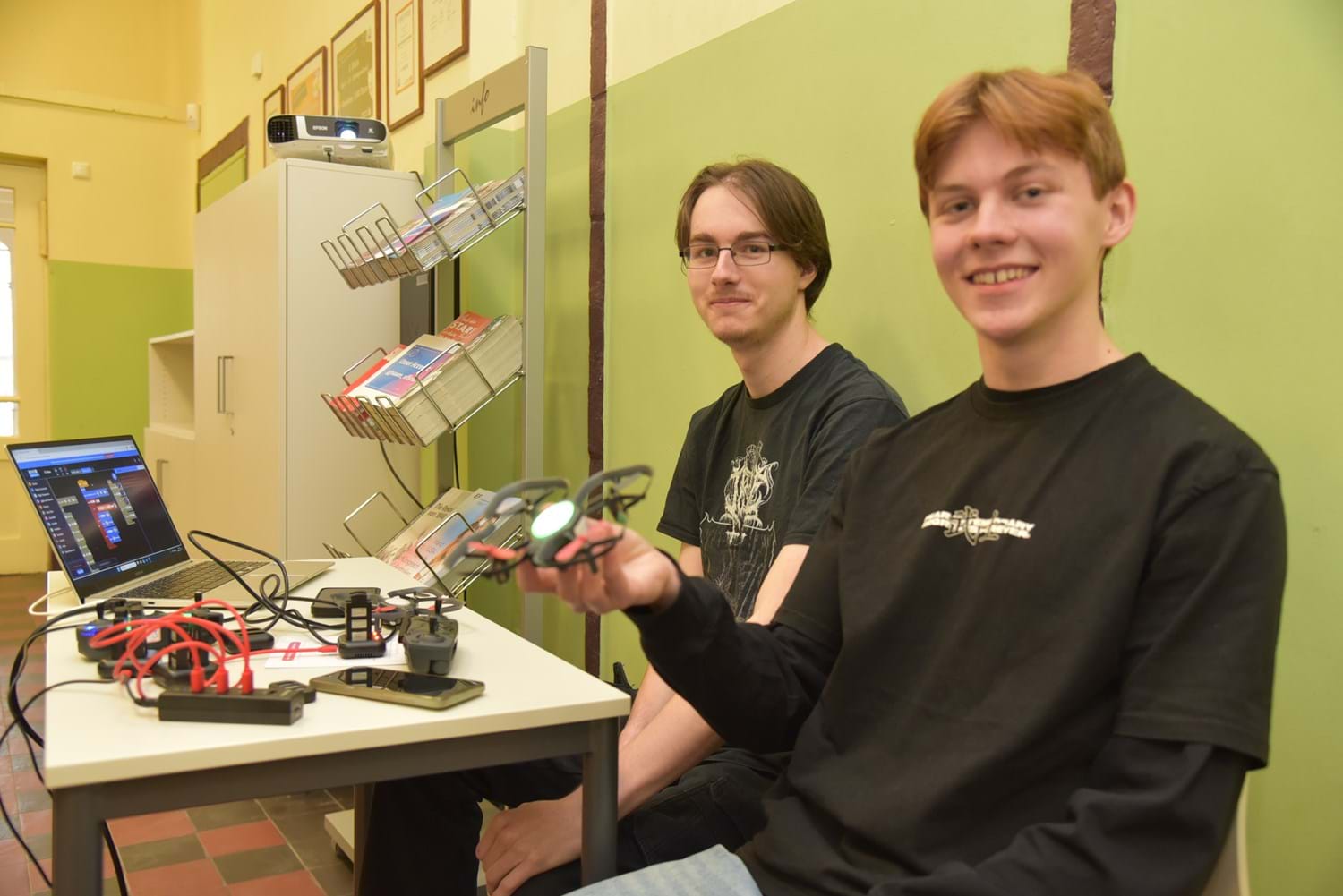 Am Info-Stand der 12er-Schüler Gustav und Albert konnte man sich einen Einblick verschaffen, was mit den beiden Drohnen im Informatik-Unterricht von Herrn Heider geschieht. "Wir sind der erste Informatikkurs, der im Unterricht Flugkurse für die beiden Drohnen programmiert", sagte Albert, und Gustav ergänzte: "Wir sind zudem eine Testgruppe, die mögliche Fehler austestet, die dann später bestenfalls behoben werden."