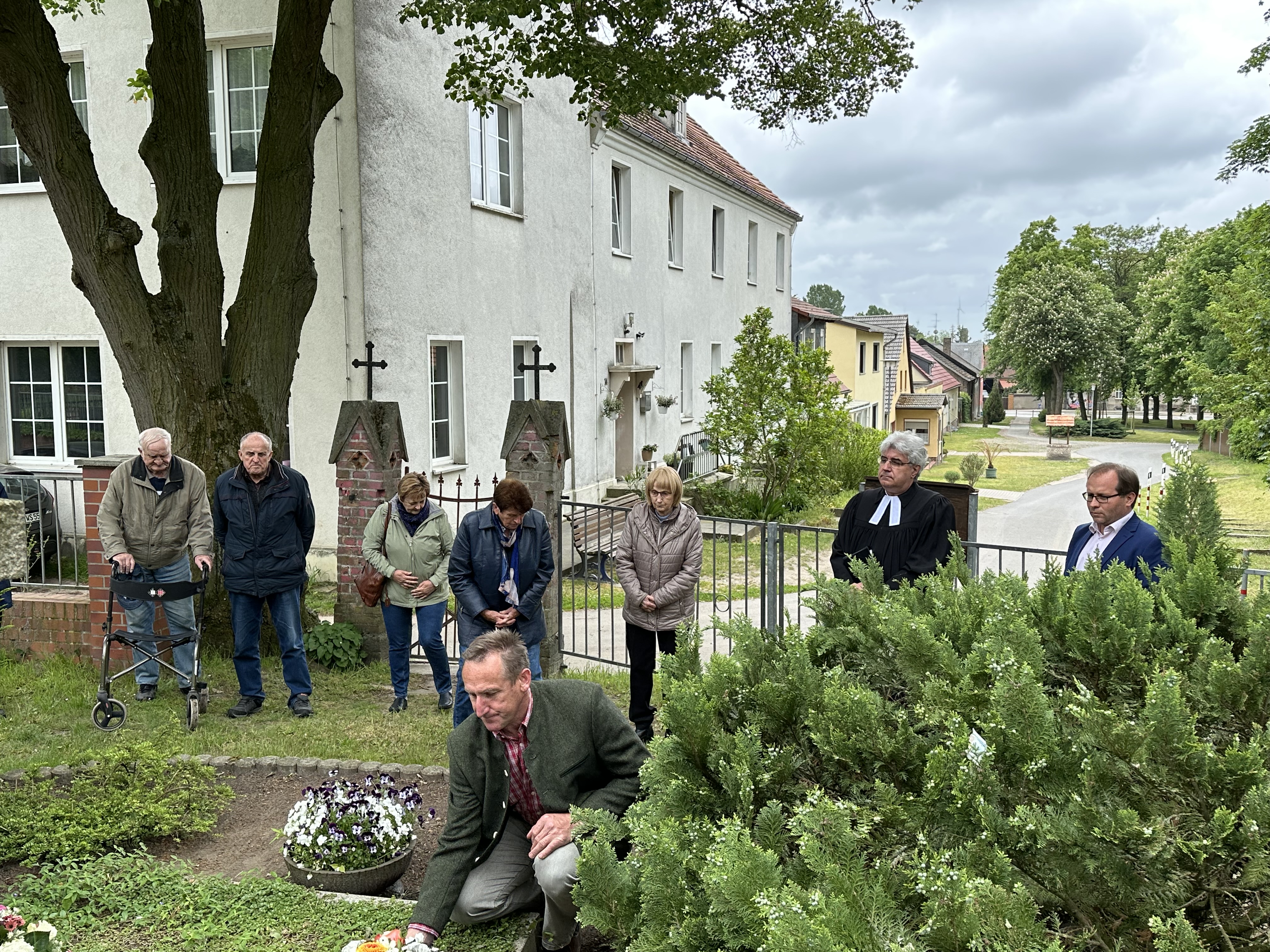 Nauens Bürgermeister Manuel Meger (LWN) und Ortvorsteher Peter Kaim (LWN+B) nahmen ebenfalls an der Andacht teil. Auch sie sind der Einladung des Gemeindekirchenrats zur Andacht gefolgt. Blumengebinde wurden am Gedenkstein auf dem Friedhof vor der Kirche niedergelegt.