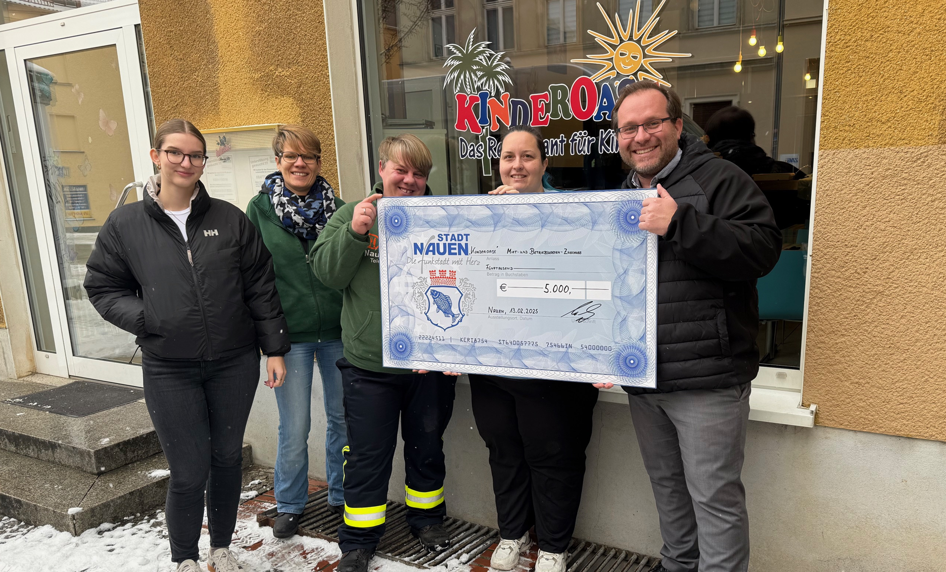 Bildunterschrift: Darline Puls (Stadt Nauen), Katrin Gille, Jeannine Stolze, Nadine Böhlicke und Bürgermeister Manuel Meger bei der Scheckübergabe (v. l.).