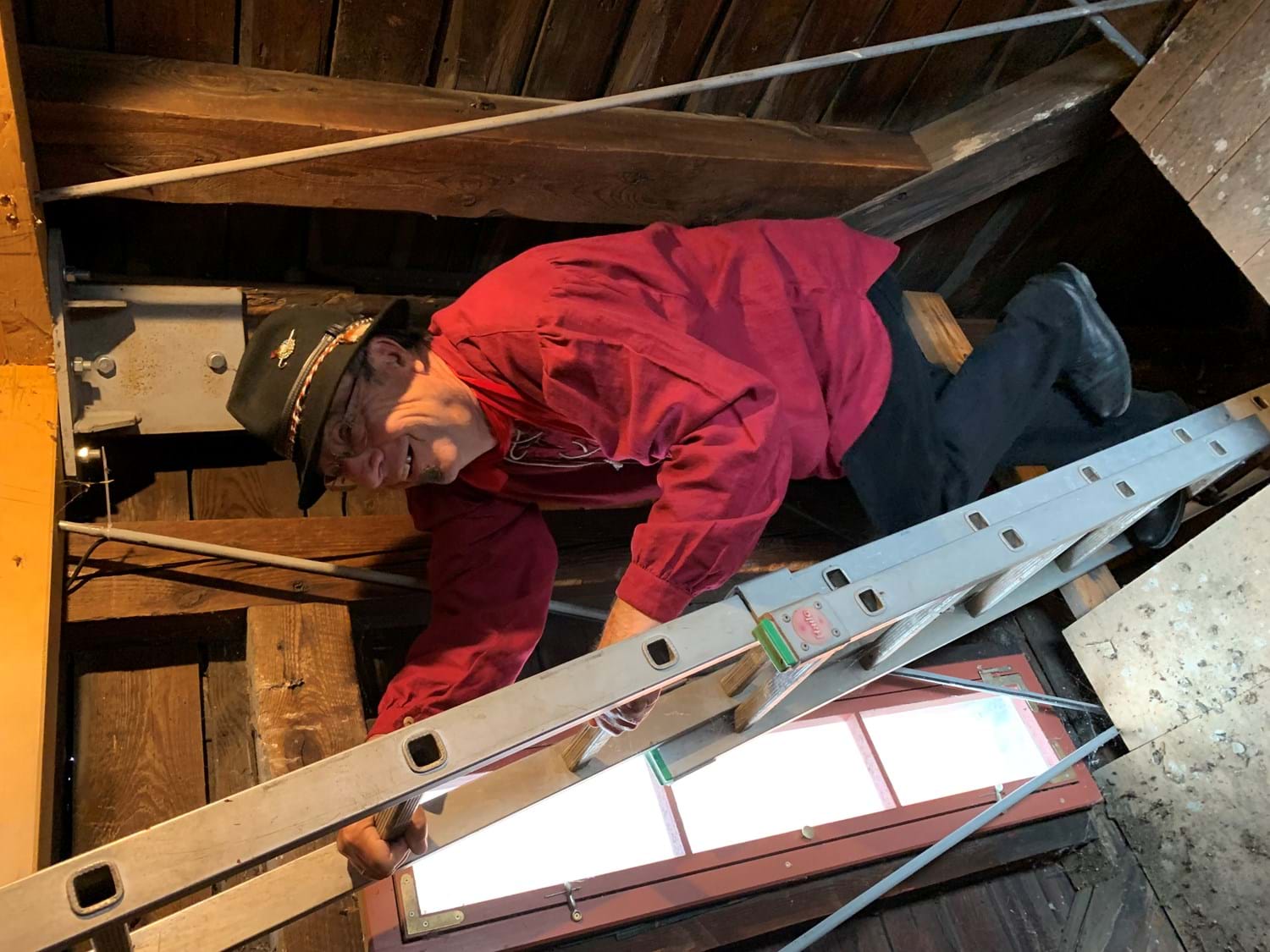 Der Nachtwächter gab am Rande einige Einblicke in Nauens lange Geschichte und welche Aufgaben so eine „echter“ Nachtwächter früher hatte. Zuvor jedoch hatte er gemeinsam mit Türmer Gerhard den Rathausturm erklettert. Der Türmer – auch Turmbläser genannt – gab mit seiner Trompete in schwindelerregender Höhe einige Melodien für die staunenden Besucher des Frischemarktes weiter unten zum Besten, wo wieder reges Treiben herrschte. „Der anstrengende Aufstieg über die vielen steilen Leitern und durch die engen Zwischenetagen ist wahrlich nichts für Jedermann“, bemerkte der Nachtwächter Wolfgang Wiech, als er wieder unten angekommen war.
