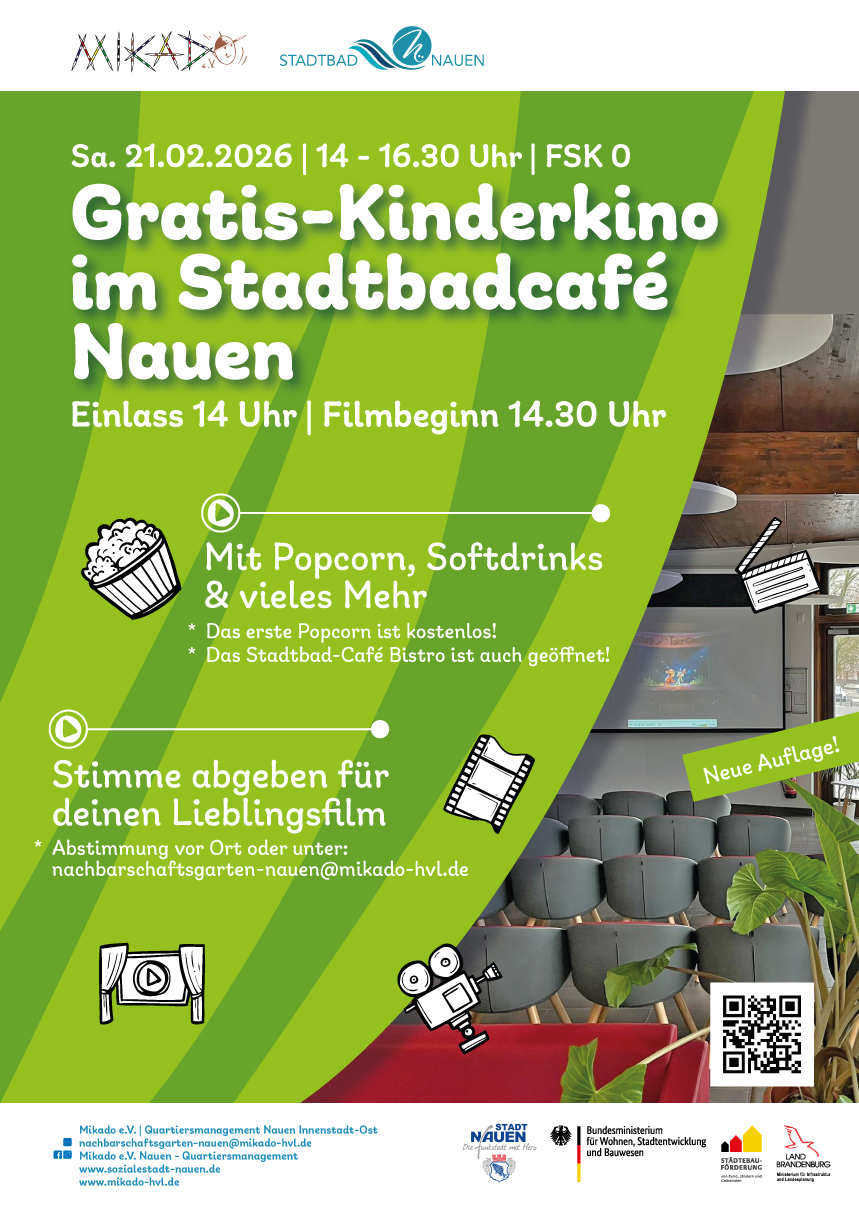 Das „Gratis Kinder-Kino“ ist zurück! Zum Jahresbeginn starten wir eine neue Auflage der beliebten Veranstaltungsreihe für die kalten Monate im Quartier. Freut euch auf spannende und pädagogisch wertvolle Filme, frisches Popcorn und unser Film-Voting – einmal pro Monat. Jedes Kind erhält das erste Popcorn gratis. Das Stadtbadcafé Bistro hat ebenfalls geöffnet.