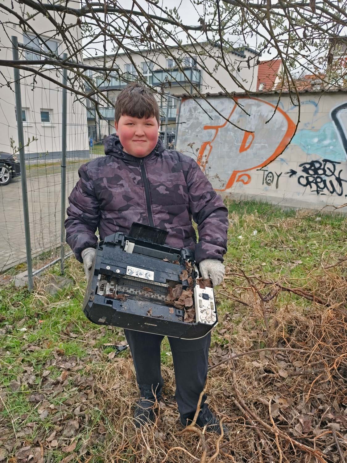 Besonders erfreulich war die Beteiligung vieler Kinder und Familien. So waren unter anderem die Kinder der Wohngruppe „Haus am Markt“ mit dabei. Hanna (10) berichtete begeistert: „Ich sammle gerne mit meinem Papa Müll, das machen wir oft im Wald. Wir wollen die Tiere und die Natur schützen.“ Auch Dominic (11), Schüler aus Nauen, engagierte sich am Karl-Bernau-Ring – einem Ort, der für ihn als Treffpunkt eine wichtige Rolle spielt: „Es ist mir wichtig, dass mein Treffpunkt sauber ist.“ Stolz präsentierte er seinen Fund: einen vollen Müllsack und einen kaputten Drucker.