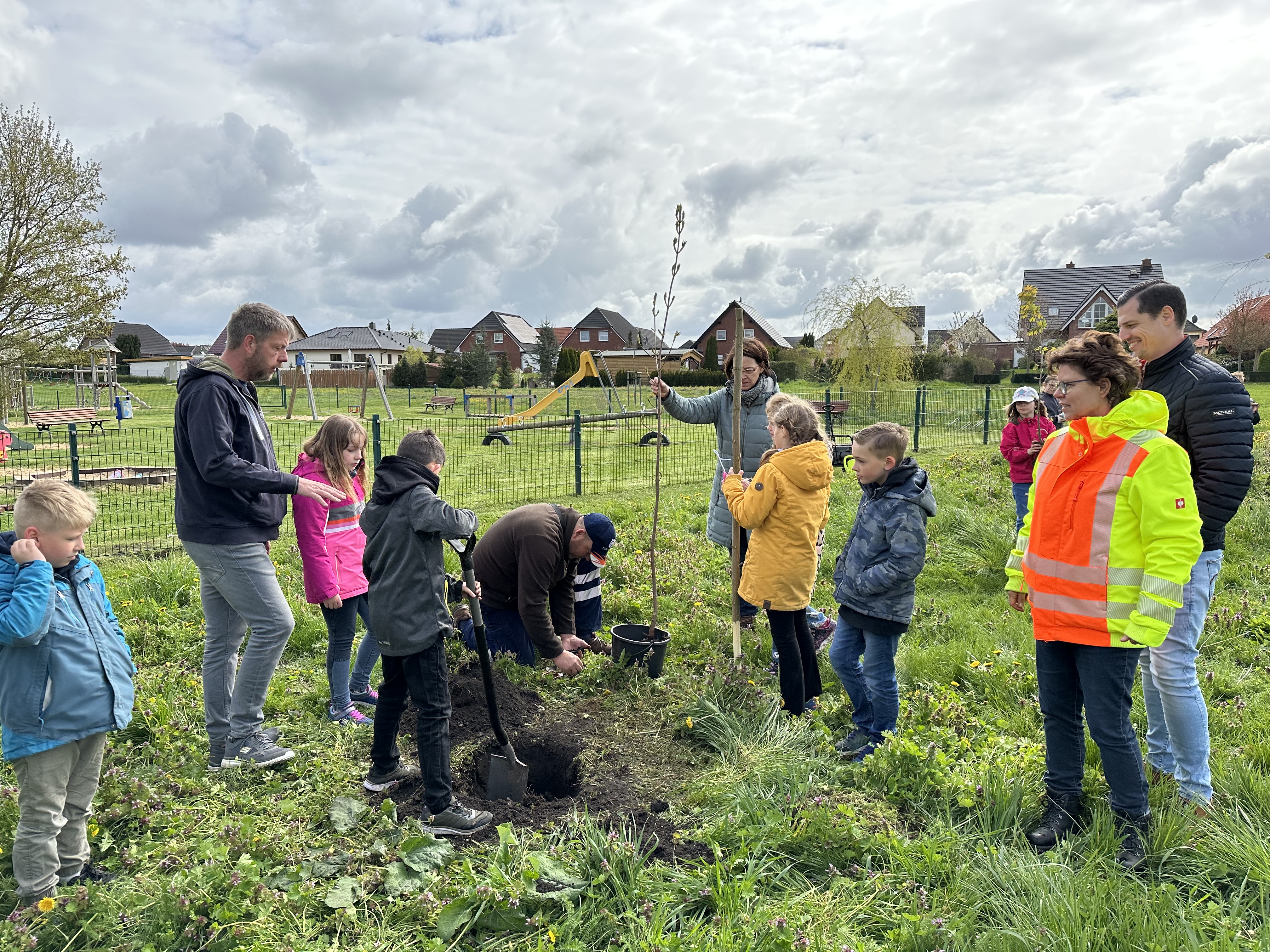 Sind die jungen Bäumchen erst einmal groß genug, werden sie den Eltern und ihren spielenden Kindern auf dem angrenzenden und idyllischen Spielplatz willkommene Schattenspender sein. Und wer weiß, vielleicht wird das ein oder andere Kind, das heute „seinen“ Ahorn-Baum gepflanzt hat, mit seinen Kindern zum Spielplatz am Mahlbusen zurückkommen und nicht ganz ohne Stolz berichten: „Schau mal, diesen Baum habe ich mal mit meiner Schulklasse gepflanzt – da war ich so groß wie Du jetzt!“