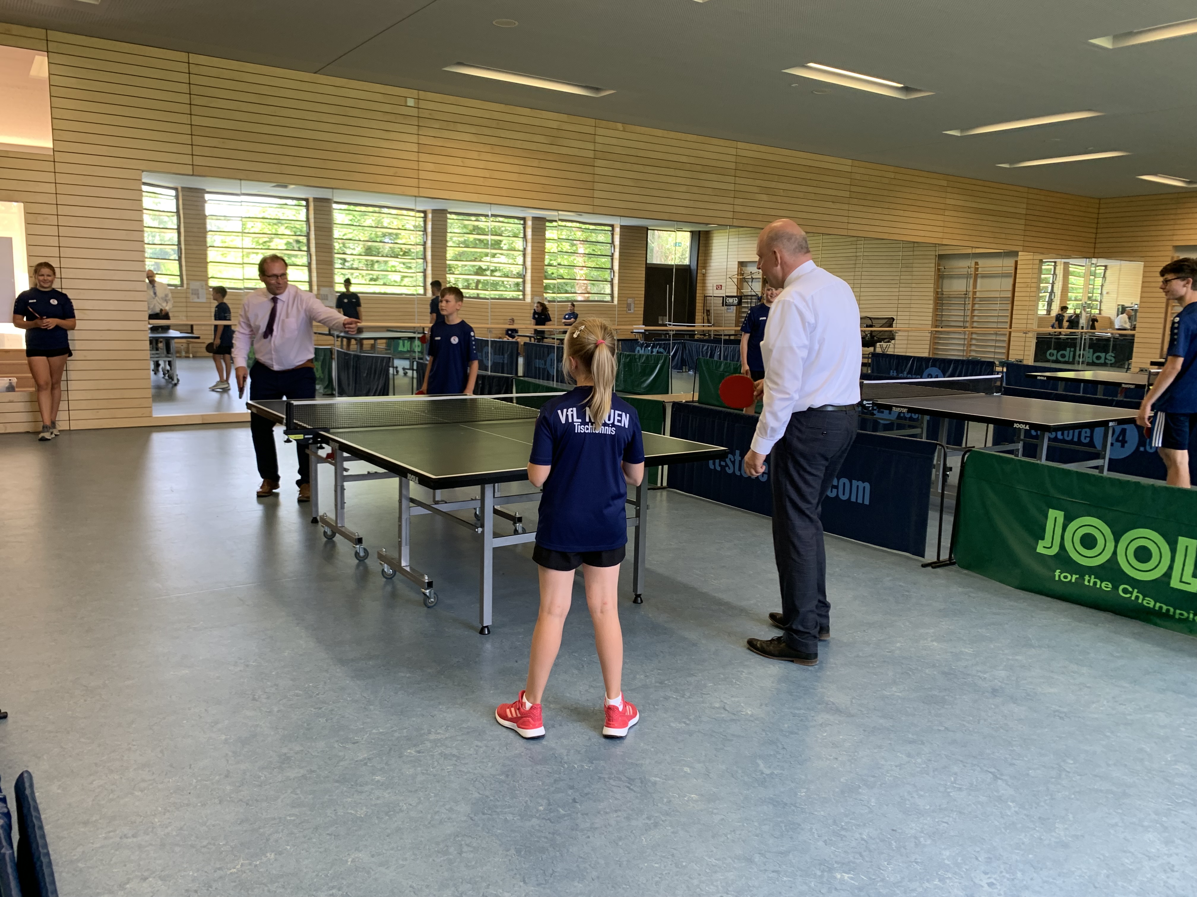 Landrat und Bürgermeister besuchen Tischtennis-Kids des VfL beim Ferientraining im Gymnasium
