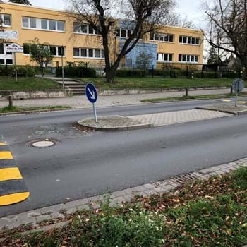Im Bereich der Verkehrsinsel wurden beidseitig Bodenschweller aufgebaut. Diese sollen dazu beitragen, die Geschwindigkeit in diesem Bereich auf die maximal erlaubten 30 km/h herunter zu reduzieren. Entsprechende Verkehrszeichen als Hinweis auf die Bodenschweller wurden mit aufgebaut.