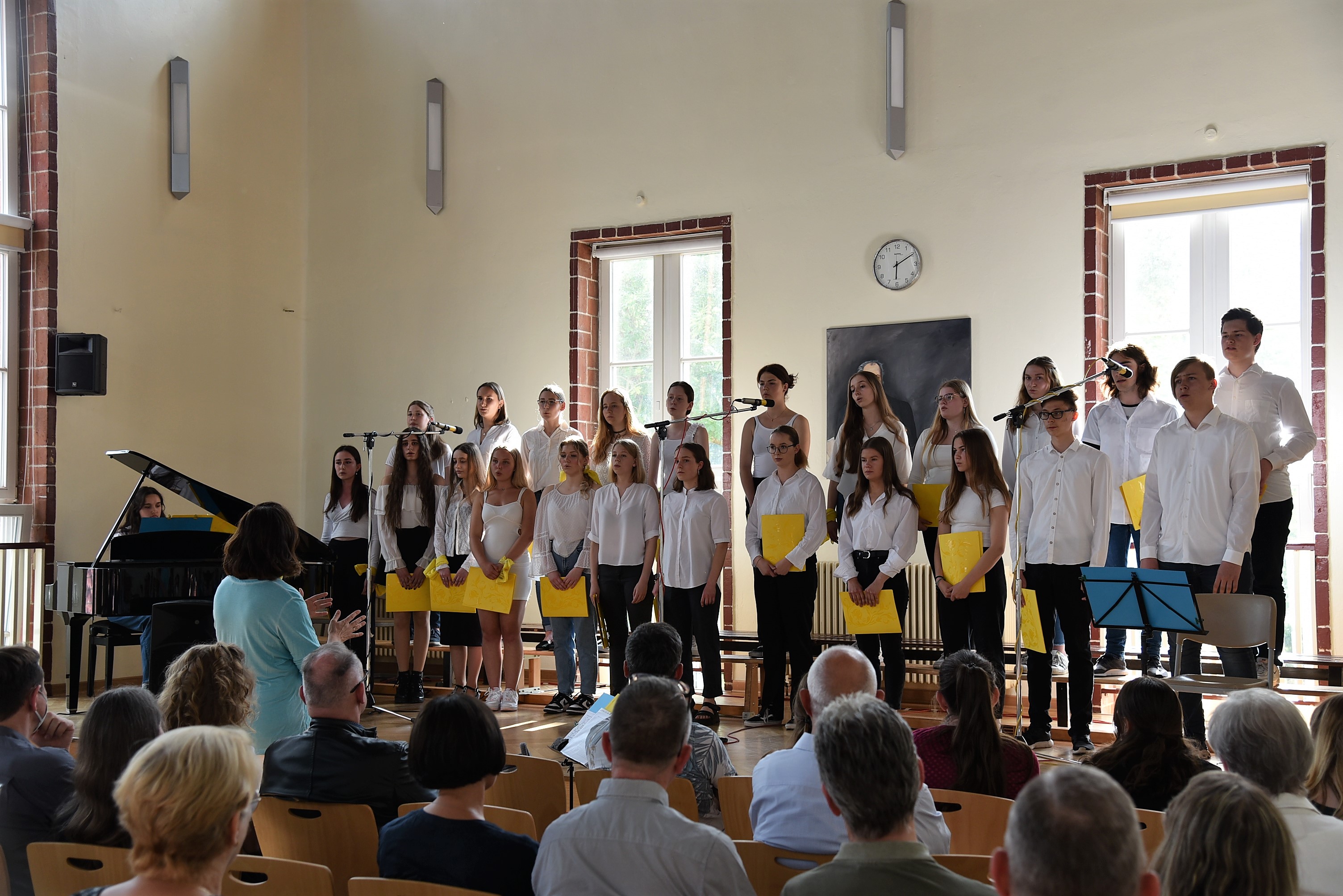 Gestaltet und organisiert wurde es vom Musikkurs der Jahrgangsstufe 11 des Goethe-Gymnasiums unter der Leitung von Claudia Stolper. Dargeboten wurde ein abwechslungsreiches Programm aus Gesangs- und Instrumentalstücken, die das Thema Frieden beinhalteten. „Die Schülerinnen und Schüler haben dieses Konzert nebst Kuchenbasar in der kleinen Pause gänzlich selbständig arrangiert und auch organisiert“, sagte Schulleiter Wieland Breuer am Rande der Veranstaltung nicht ohne Stolz. Die Spenden werden nun gemeinnützigen Zwecke in der Ukraine zugutekommen.