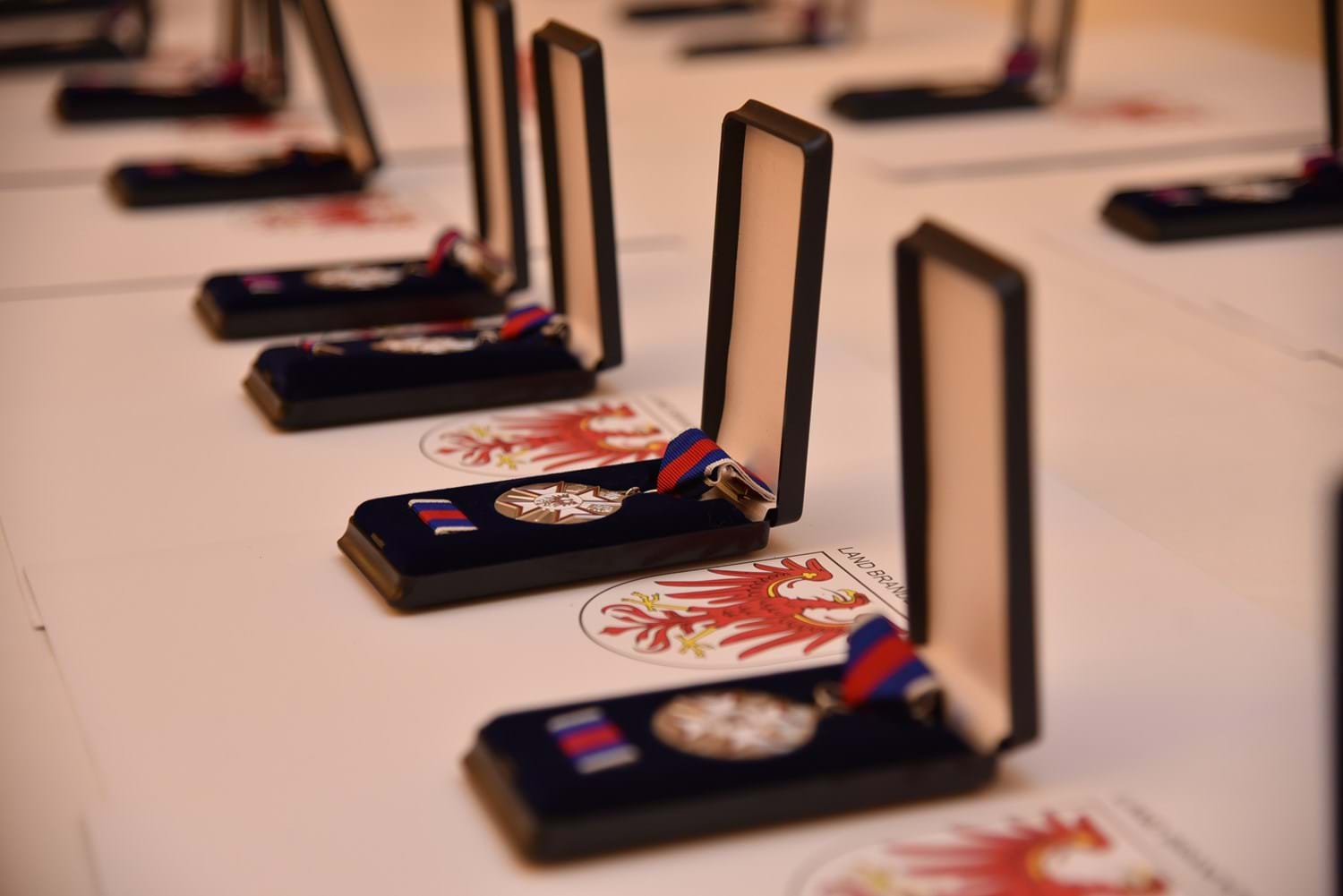 Kupfer, Silber, Gold und Ehrengold: Die Medaillen und die dazugehörigen Urkunden wurden von Bürgermeister Manuel Meger (Die Ländliche) überreicht – im Beisein von dem Vorsitzenden der Nauener Stadtverordnetenversammlung Eckart Johlige (CDU), dem Vorsitzenden des Ausschusses für Ordnung und Sicherheit und zukünftigen Bürgermeister Dr. Michael Wiebersinsky (parteilos) sowie dem Stadtwehrführer Jörg Meyer verliehen.
