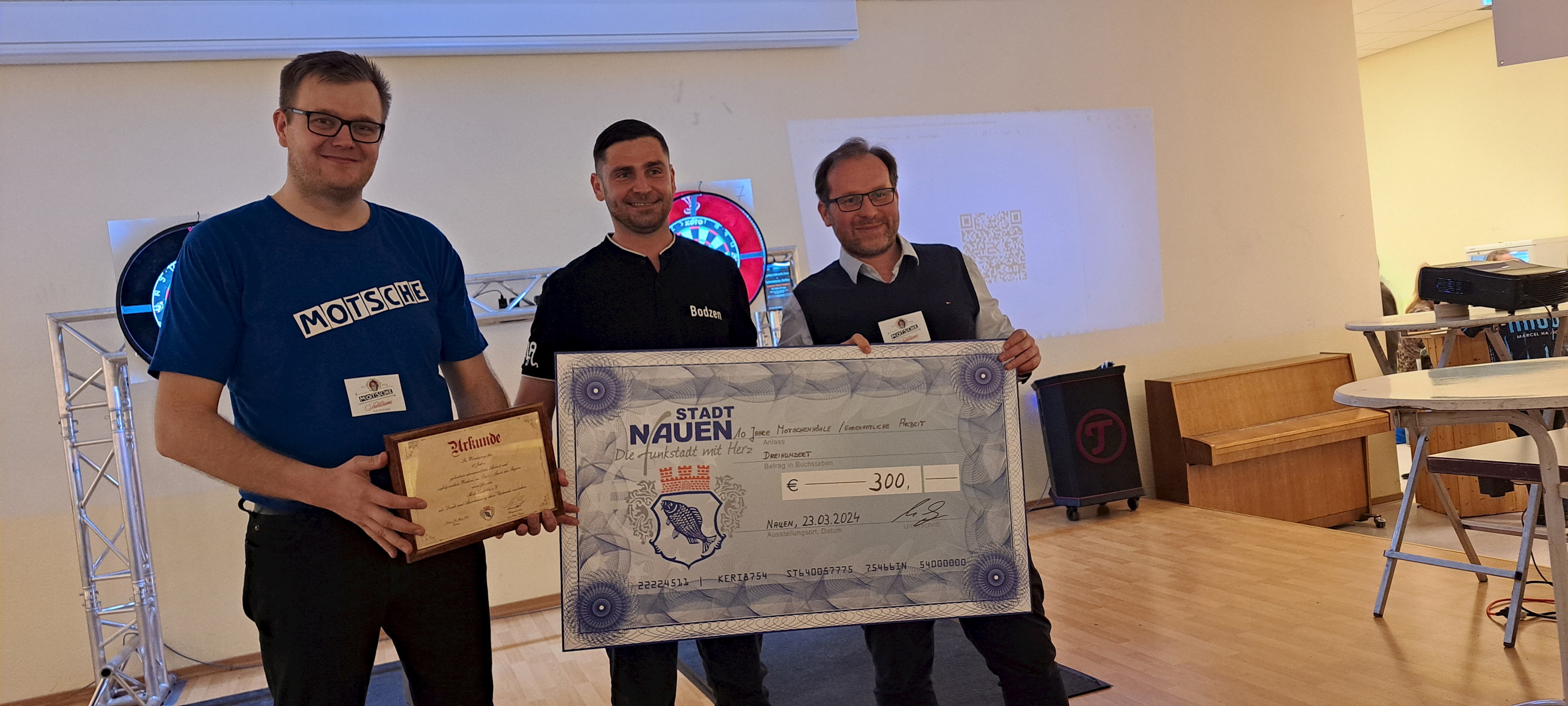 Unter den Teilnehmern war auch Nauens Bürgermeister Manuel Meger (LWN), der zum Turnierstart dem Verein eine Anerkennung für die geleistete ehrenamtliche Arbeit überreichte. „Die Motschenhöhle/Motsche hat durch ihre Aktivitäten und Turniere nicht nur das Interesse am Dartsport in unserer Stadt und bei mir geweckt, sondern hat einen positiven Beitrag zur Förderung des Gemeinschaftssinns geleistet. Ich möchte daher allen Mitgliedern, Trainern, Unterstützern und Freunden des Vereins meinen herzlichen Dank aussprechen – weiter so“, lobte der Bürgermeister.